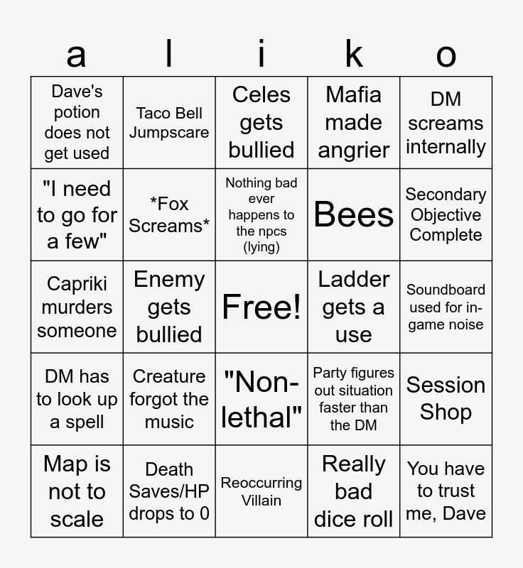 This bingo card has a free space and 29 words: Map is not to scale, Illegal* shenanigans, Enemy gets bullied, Crit on Players, Dave's potion does not get used, Celes gets bullied, *Fox Screams*, Creature forgot the music, Ladder gets a use, Death Saves/HP drops to 0, Soundboard used for in-game noise, You have to trust me, Dave, Reoccurring Villain, Really bad dice roll, Secondary Objective Complete, Callback to previous session, "Non-lethal", DM has to look up a spell, DM screams internally, Capriki murders someone, Party figures out situation faster than the DM, Fenix causes an incident, Bees, "I need to go for a few", Mafia made angrier, Taco Bell Jumpscare, Session Shop, Nothing bad ever happens to the npcs (lying) and Session somehow turns to be better than expected.