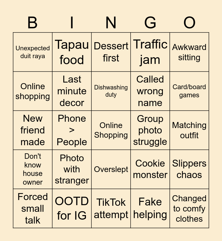 This bingo card has a free space and 30 words: OOTD for IG, Repeat outfit, Phone > People, Came for food, Unexpected duit raya, Dessert first, Last minute decor, Overslept, Group photo struggle, TikTok attempt, Matching outfit, Changed to comfy clothes, Fake helping, Gaming during visit, Card/board games, Gossip session, Cookie monster, Don't know house owner, Photo with stranger, Awkward sitting, New friend made, Snacking while salam, Tapau food, Called wrong name, Online shopping, Traffic jam, Slippers chaos, Forced small talk, Dishwashing duty and Sleep anywhere.