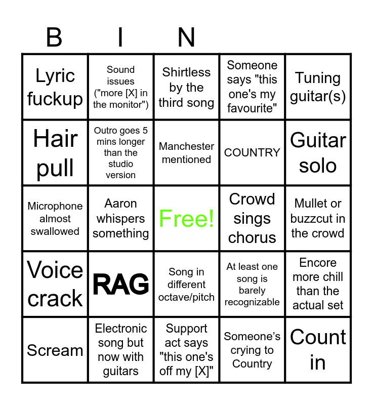 This bingo card has a free space and 24 words: RAG, Electronic song but now with guitars, Manchester mentioned, Scream, Tuning guitar(s), Lyric fuckup, Hair pull, Sound issues ("more [X] in the monitor"), Crowd sings chorus, Song in different octave/pitch, COUNTRY, Microphone almost swallowed, At least one song is barely recognizable, Encore more chill than the actual set, Outro goes 5 mins longer than the studio version, Someone’s crying to Country, Mullet or buzzcut in the crowd, Shirtless by the third song, Guitar solo, Aaron whispers something, Count in, Voice crack, Someone says "this one's my favourite" and Support act says "this one's off my [X]".
