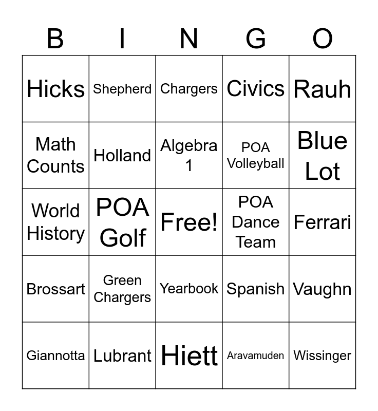 This bingo card has a free space and 34 words: Adams, Aravamuden, Bean, Campbell, Brossart, Holland, Rauh, Giannotta, Shepherd, ICT, Algebra 1, Chargers, POA Baseball, Symphonic Band, POA Dance Team, Blue Lot, Lubrant, World History, Green Chargers, Spanish, Yearbook, Mrs. Monsanto, Hicks, Ferrari, Hiett, Wissinger, Civics, POA Cheer, POA Volleyball, Math Counts, Theater, POA Golf, Vaughn and SOS Club.