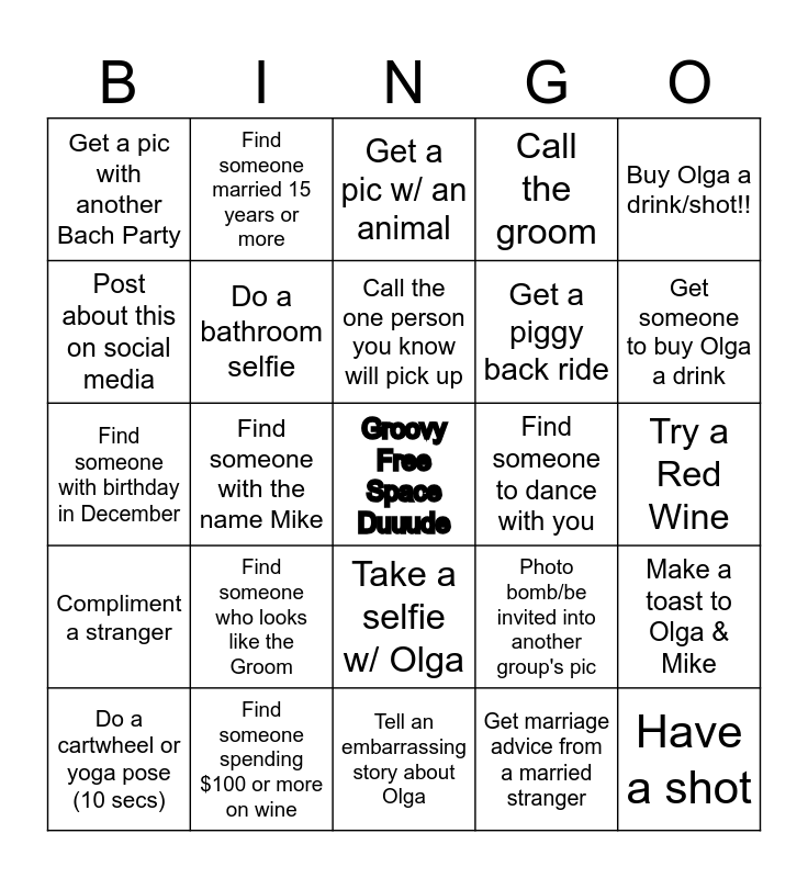 This bingo card has a free space and 24 words: Find someone who looks like the Groom, Find someone spending $100 or more on wine, Call the one person you know will pick up, Do a cartwheel or yoga pose (10 secs), Buy Olga a drink/shot!!, Get a pic with another Bach Party, Post about this on social media, Find someone married 15 years or more, Find someone to dance with you, Take a selfie w/ Olga, Get a piggy back ride, Find someone with birthday in December, Photo bomb/be invited into another group's pic, Make a toast to Olga & Mike, Do a bathroom selfie, Get marriage advice from a married stranger, Try a Red Wine, Get a pic w/ an animal, Get someone to buy Olga a drink, Find someone with the name Mike, Have a shot, Compliment a stranger, Call the groom and Tell an embarrassing story about Olga.