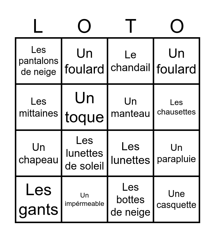 This bingo card has 20 words: Un parapluie, Les bottes en caoutchouc, Le chandail, Les bottes, Les gants, Les mittaines, Un impérmeable, Les pantalons de neige, Un chapeau, Un foulard, Les lunettes de soleil, Les lunettes, Un toque, Une casquette, Un manteau, Les chaussures, Les chausettes, Un foulard, Les bottes de neige and Un sac a dos.