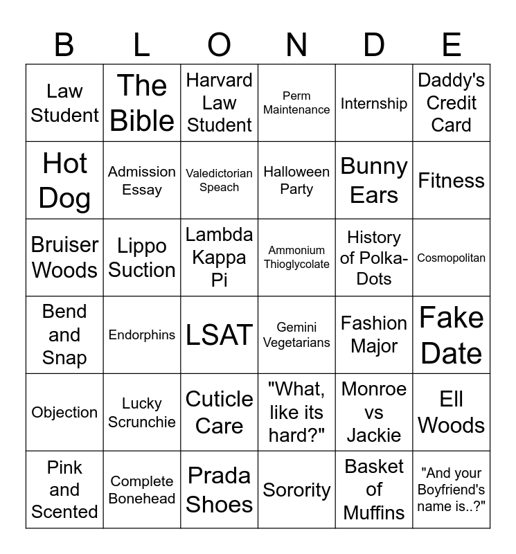 This bingo card has 36 words: "What, like its hard?", Cuticle Care, Sorority, Hot Dog, Bend and Snap, Ammonium Thioglycolate, Admission Essay, Prada Shoes, Internship, Monroe vs Jackie, Fitness, Perm Maintenance, Ell Woods, Lippo Suction, Halloween Party, Law Student, Objection, History of Polka-Dots, Bruiser Woods, Harvard Law Student, Lambda Kappa Pi, Endorphins, Gemini Vegetarians, LSAT, Fashion Major, The Bible, Bunny Ears, Complete Bonehead, Valedictorian Speach, Daddy's Credit Card, "And your Boyfriend's name is..?", Pink and Scented, Fake Date, Cosmopolitan, Lucky Scrunchie and Basket of Muffins.