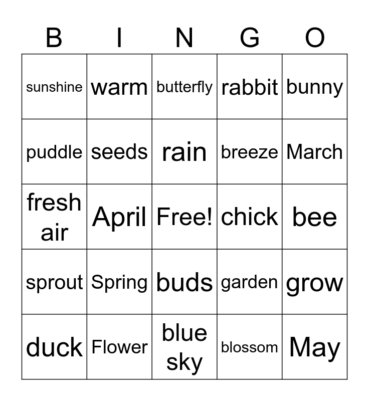 This bingo card has a free space and 24 words: Spring, Flower, rain, duck, bunny, sunshine, puddle, warm, chick, buds, breeze, fresh air, garden, grow, seeds, blossom, bee, butterfly, March, April, May, sprout, rabbit and blue sky.