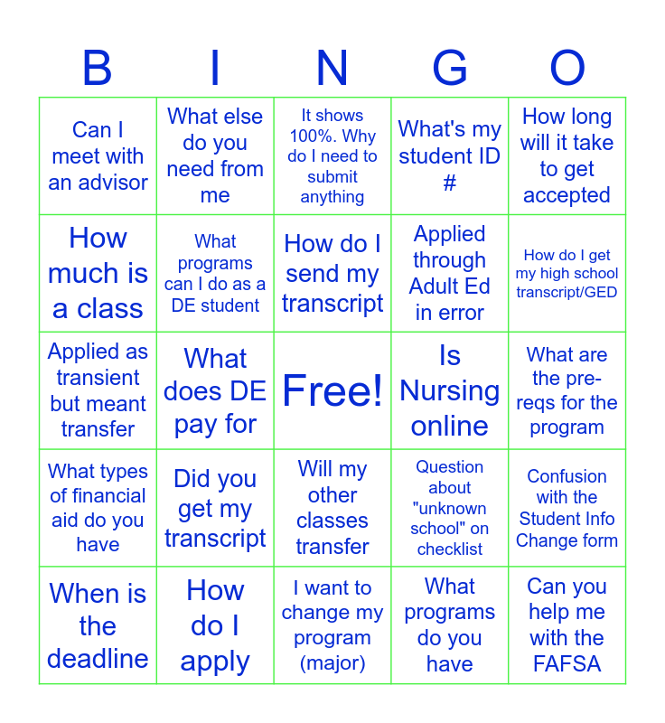 This bingo card has a free space and 24 words: Did you get my transcript, How do I apply, How do I send my transcript, When is the deadline, How long will it take to get accepted, Can I meet with an advisor, How much is a class, What else do you need from me, Is Nursing online, Will my other classes transfer, Applied through Adult Ed in error, Applied as transient but meant transfer, Question about "unknown school" on checklist, Confusion with the Student Info Change form, What programs can I do as a DE student, What programs do you have, What are the pre-reqs for the program, It shows 100%. Why do I need to submit anything, How do I get my high school transcript/GED, What does DE pay for, Can you help me with the FAFSA, What types of financial aid do you have, What's my student ID # and I want to change my program (major).