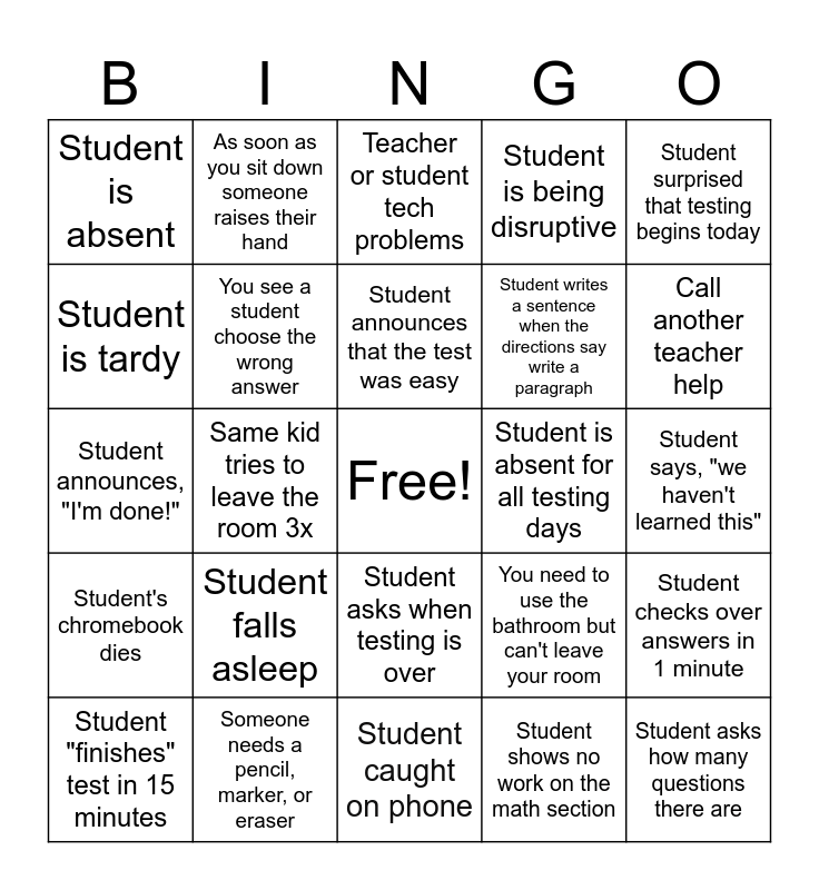 This bingo card has a free space and 24 words: Student falls asleep, Someone needs a pencil, marker, or eraser, Student announces that the test was easy, Student "finishes" test in 15 minutes, Student surprised that testing begins today, Student is absent, Student is tardy, As soon as you sit down someone raises their hand, Student is absent for all testing days, Student asks when testing is over, Student writes a sentence when the directions say write a paragraph, Student announces, "I'm done!", You need to use the bathroom but can't leave your room, Student checks over answers in 1 minute, You see a student choose the wrong answer, Student shows no work on the math section, Student says, "we haven't learned this", Teacher or student tech problems, Call another teacher help, Same kid tries to leave the room 3x, Student asks how many questions there are, Student's chromebook dies, Student is being disruptive and Student caught on phone.