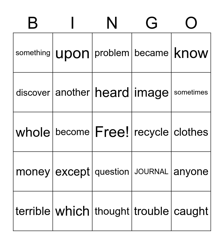 This bingo card has a free space and 37 words: afraid, almost, always, another, anyone, except, heard, high, know, knew, become, became, caught, clothes, discover, money, myself, problem, question, recycle, something, sometimes, terrible, thought, through, trouble, upon, vacation, watch, wear, weather, which, whole, WINNER, JOURNAL, image and number.