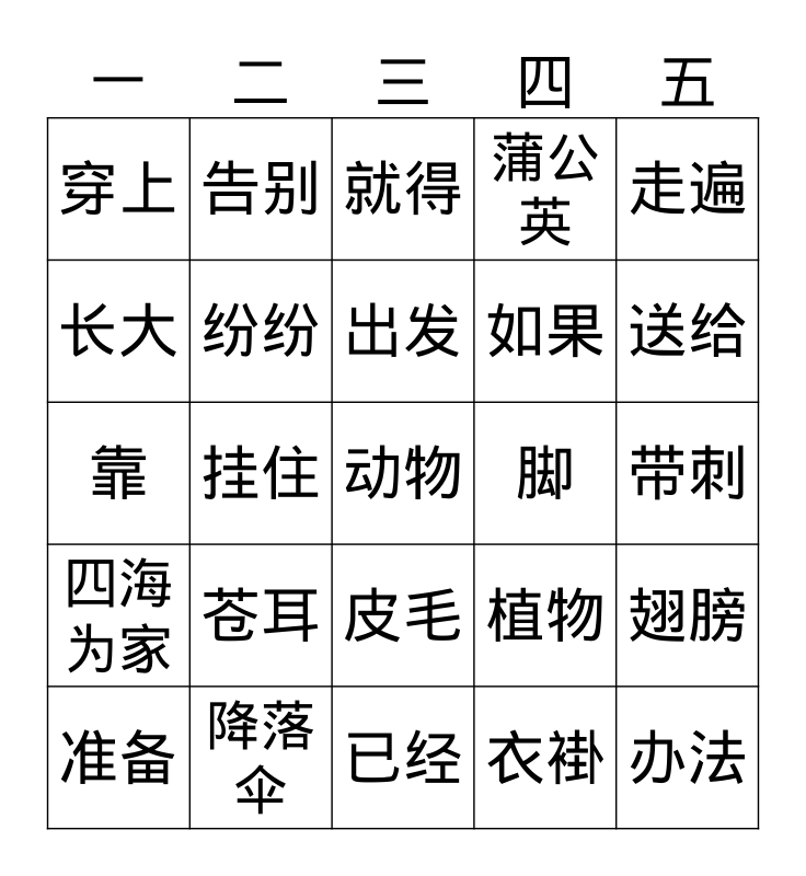 This bingo card has 27 words: 植物, 办法, 如果, 已经, 长大, 就得, 告别, 四海为家, 脚, 翅膀, 靠, 蒲公英, 准备, 降落伞, 送给, 微风, 纷纷, 出发, 苍耳, 穿上, 带刺, 衣褂, 挂住, 动物, 皮毛, 走遍 and 天下.