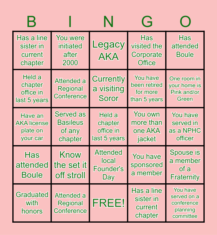This bingo card has 25 words: Has attended Boule, Attended a Regional Conference, Held a chapter office in last 5 years, Has a line sister in current chapter, Has attended Boule, Has a line sister in current chapter, You were initiated after 2000, Legacy AKA, You own more than one AKA jacket, Spouse is a member of a Fraternity, Held a chapter office in last 5 years, Attended a Regional Conference, FREE!, You have sponsored a member, One room in your home is Pink and/or Green, Graduated with honors, Served as Basileus of any chapter, Currently a visiting Soror, You have been retired for more than 5 years, You have served in as a NPHC officer, Have an AKA license plate on your car, Know the set it off stroll, Attended local Founder's Day, Has visited the Corporate Office and You have served on a conference planning committee.