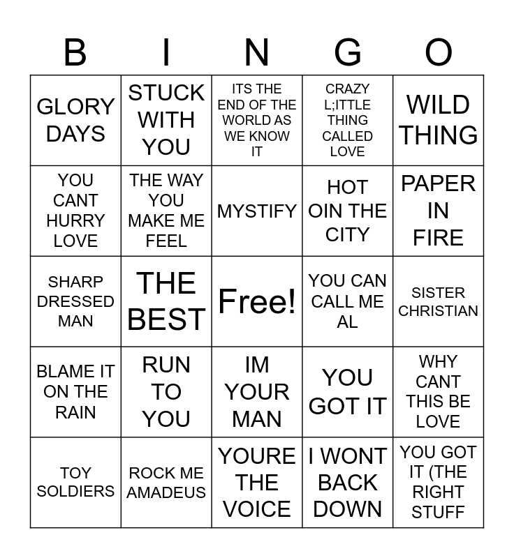 This bingo card has a free space and 35 words: FIGHT FOR YOUR RIGHT, YOU MAKE MY DREAMS (COME TRUE), CENTERFOLD, THE WAY YOU MAKE ME FEEL, IM YOUR MAN, CRAZY L;ITTLE THING CALLED LOVE, YOU CANT HURRY LOVE, GOOD THING, MYSTIFY, GET OUTTA MY DREAMS GET INTO MY CAR, SHARP DRESSED MAN, WILD THING, WALK OF LIFE, LIVING IN AMERICA, GLORY DAYS, YOU CAN CALL ME AL, I WONT BACK DOWN, THE BEST, BLAME IT ON THE RAIN, YOU GOT IT (THE RIGHT STUFF, YOU GOT IT, TOY SOLDIERS, WHY CANT THIS BE LOVE, ROCK ME AMADEUS, ITS THE END OF THE WORLD AS WE KNOW IT, PAPER IN FIRE, SAY YOU,SAY ME, INVISIBLE TOUCH, HOT OIN THE CITY, SISTER CHRISTIAN, TAKE ME HOME TONIGHT, YOURE THE VOICE, RUN TO YOU, STUCK WITH YOU and BIG TIME.
