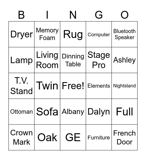 This bingo card has a free space and 79 words: Chaise Lounge, Refrigerator, Rug, Mirror, Range, Console, Air Conditioner, Television, Sectional, Coffee End Tables, Washer, Loveseat, Computer, Dryer, Bed Frame, Lamp, Mattress, Sofa, Chest Freezer, Nightstand, Chest, Bluetooth Speaker, T.V. Stand, Dinning Table, Living Room, Dinning Room, Kitchen, Bedroom, Den, Fitzgerald, Ashley, Hot Point, GE, Crosley, Crown Mark, Elements, Frigidaire, Vitara, Midea, French Door, Top Mount, Side by Side, Coil Top, Smooth Top, Pillow Top, Memory Foam, Chime Hybrid, Firm, King, Queen, Full, Twin, Dalyn, Samsung, TCL, Hisense, Sharp, LG, Technical Pro, Albany, Stage Pro, Gemini Pro, Progressive, Global Funiture, Simply Bunk Beds, Recliner, Chair, Table, Desk, Ottoman, Oak, Pine, Cherry, Walnut, Baber's, Furniture, Appliances, Electronics and Same as Cash.