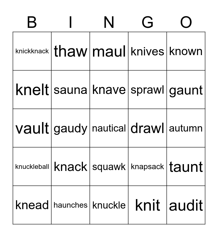 This bingo card has 25 words: knack, knuckle, knave, knead, known, knickknack, knelt, thaw, drawl, squawk, sprawl, vault, knapsack, taunt, sauna, audit, autumn, maul, gaunt, gaudy, nautical, haunches, knuckleball, knives and knit.