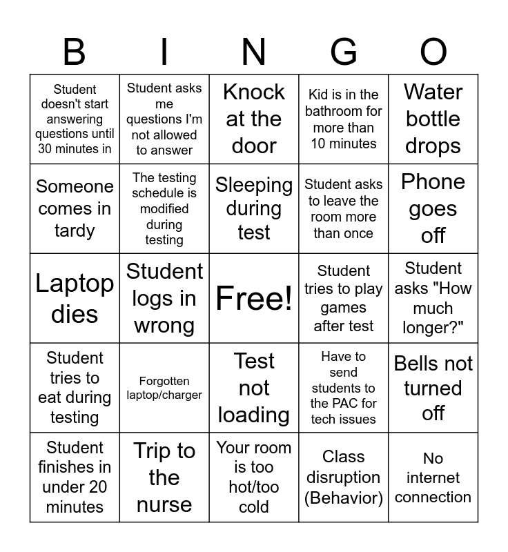 This bingo card has a free space and 24 words: Forgotten laptop/charger, Trip to the nurse, Sleeping during test, Student finishes in under 20 minutes, Water bottle drops, Student doesn't start answering questions until 30 minutes in, Someone comes in tardy, Student asks me questions I'm not allowed to answer, Student tries to play games after test, Test not loading, Student asks to leave the room more than once, Laptop dies, Have to send students to the PAC for tech issues, Bells not turned off, The testing schedule is modified during testing, Class disruption (Behavior), Student asks "How much longer?", Knock at the door, Phone goes off, Student logs in wrong, No internet connection, Student tries to eat during testing, Kid is in the bathroom for more than 10 minutes and Your room is too hot/too cold.