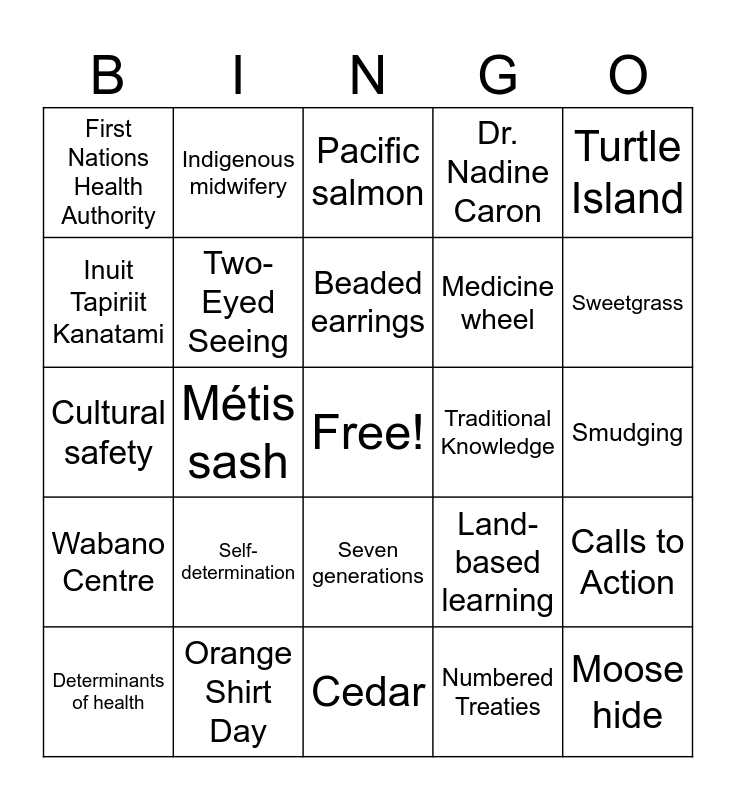 This bingo card has a free space and 24 words: Self-determination, Orange Shirt Day, Beaded earrings, Determinants of health, Turtle Island, First Nations Health Authority, Inuit Tapiriit Kanatami, Indigenous midwifery, Traditional Knowledge, Seven generations, Medicine wheel, Cultural safety, Land-based learning, Calls to Action, Two-Eyed Seeing, Numbered Treaties, Smudging, Pacific salmon, Sweetgrass, Métis sash, Moose hide, Wabano Centre, Dr. Nadine Caron and Cedar.