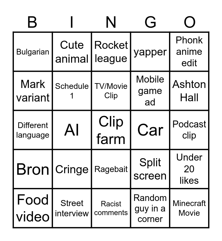 This bingo card has a free space and 24 words: Cringe, Street interview, TV/Movie Clip, Food video, Phonk anime edit, Bulgarian, Mark variant, Cute animal, Car, Ragebait, Mobile game ad, Different language, Split screen, Under 20 likes, Schedule 1, Random guy in a corner, Podcast clip, Rocket league, Ashton Hall, AI, Minecraft Movie, Bron, yapper and Racist comments.