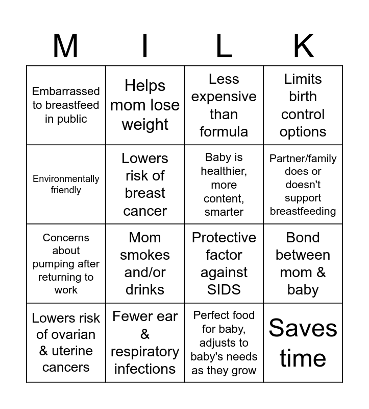 This bingo card has 16 words: Fewer ear & respiratory infections, Bond between mom & baby, Less expensive than formula, Embarrassed to breastfeed in public, Concerns about pumping after returning to work, Helps mom lose weight, Protective factor against SIDS, Perfect food for baby, adjusts to baby's needs as they grow, Environmentally friendly, Lowers risk of breast cancer, Lowers risk of ovarian & uterine cancers, Limits birth control options, Mom smokes and/or drinks, Partner/family does or doesn't support breastfeeding, Baby is healthier, more content, smarter and Saves time.