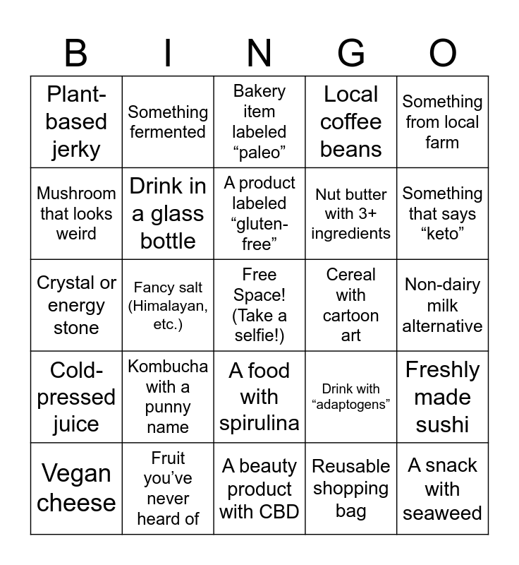 This bingo card has a free space and 24 words: Kombucha with a punny name, Fruit you’ve never heard of, A product labeled “gluten-free”, Vegan cheese, Something from local farm, Plant-based jerky, Mushroom that looks weird, Something fermented, Cereal with cartoon art, A food with spirulina, Nut butter with 3+ ingredients, Crystal or energy stone, Drink with “adaptogens”, Freshly made sushi, Drink in a glass bottle, Reusable shopping bag, Non-dairy milk alternative, Bakery item labeled “paleo”, Something that says “keto”, Fancy salt (Himalayan, etc.), A snack with seaweed, Cold-pressed juice, Local coffee beans and A beauty product with CBD.