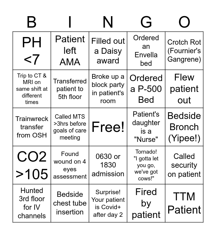 This bingo card has a free space and 44 words: Tube Exchange, TTM Patient, Lactic >10, Hunted 3rd floor for IV channels, Visitor brought in a baby, Fired by patient, Filled out a Daisy award, Violent Restraints, Crotch Rot (Fournier's Gangrene), Bedside chest tube insertion, Ordered an Envella bed, Patient's daughter is a "Nurse", 0630 or 1830 admission, Found wound on 4 eyes assessment, Asked visitor to wear shoes, Surprise! Your patient is Covid+ after day 2, Brain Drain, Trainwreck transfer from OSH, Raided the Intensive Cravings Unit, Flew patient out, Patient left AMA, Admitted a fresh trauma, Called an inpatient code stroke, PH <7, Mass Transfusion Protocol, Bedside Bronch (Yipee!), "Securrity! This visitor's got to go", Took full lunch break off the floor, Tornado! "I gotta let you go, we've got cows!", CO2 >105, Wrote a star award, Called security on patient, Took the in-house code blue patient, Keepin' them alive 'til 7:05 on 4 pressors, Called MTS >3hrs before goals of care meeting, Responded to CAT/Code Blue, Filled out a Toni Award, CRRT cartridge clotted, Broke up a block party in patient's room, Trip to CT & MRI on same shift at different times, Ordered a P-500 Bed, Mystery stain on scrubs, Transferred patient to 5th floor and Ejected a visitor.