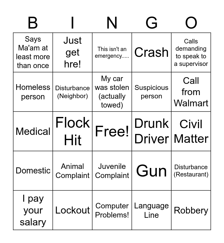 This bingo card has a free space and 24 words: Animal Complaint, Lockout, My car was stolen (actually towed), I pay your salary, Calls demanding to speak to a supervisor, Says Ma'am at least more than once, Homeless person, Just get hre!, Drunk Driver, Juvenile Complaint, Suspicious person, Medical, Gun, Disturbance (Restaurant), Disturbance (Neighbor), Language Line, Civil Matter, This isn't an emergency....., Call from Walmart, Flock Hit, Robbery, Domestic, Crash and Computer Problems!.