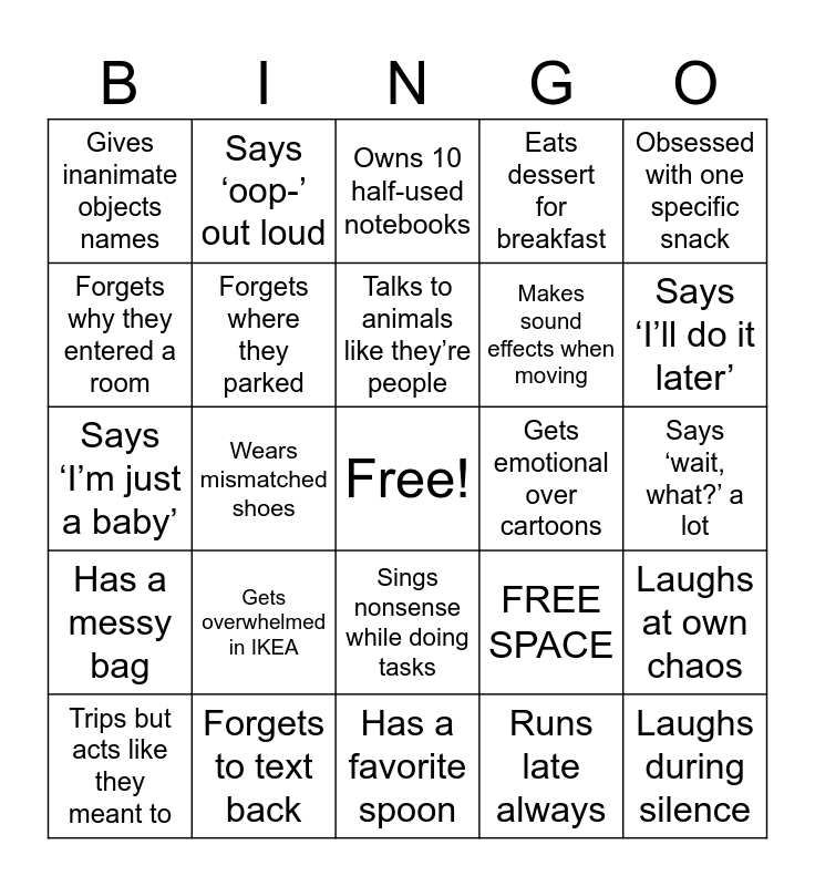 This bingo card has a free space and 25 words: Gets overwhelmed in IKEA, Has a favorite spoon, Talks to animals like they’re people, Trips but acts like they meant to, Obsessed with one specific snack, Gives inanimate objects names, Forgets why they entered a room, Says ‘oop-’ out loud, Gets emotional over cartoons, Sings nonsense while doing tasks, Makes sound effects when moving, Says ‘I’m just a baby’, FREE SPACE, Laughs at own chaos, Forgets where they parked, Has a random bruise, Says ‘wait, what?’ a lot, Owns 10 half-used notebooks, Says ‘I’ll do it later’, Wears mismatched shoes, Laughs during silence, Forgets to text back, Has a messy bag, Eats dessert for breakfast and Runs late always.