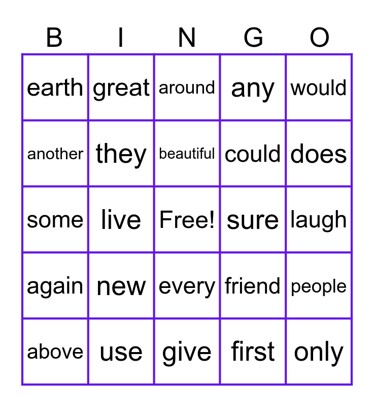 This bingo card has a free space and 34 words: said, first, done, there, again, they, would, above, great, were, beautiful, around, also, write, sure, does, use, some, new, friend, every, often, earth, laugh, give, only, any, should, could, another, together, live, people and different.