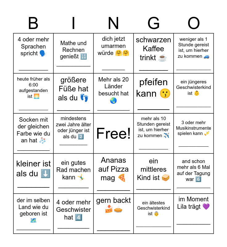 This bingo card has a free space and 29 words: der im selben Land wie du geboren ist 🗺️ ___________, denselben mittleren Anfangsbuchstaben hat ✍️ ________________, mindestens zwei Jahre älter oder jünger ist als du 2️⃣ __________, für dich jetzt ein Lied singt🦜 __________, 4 oder mehr Sprachen spricht 🗣️ _________, dich jetzt umarmen würde 🤗🤗 _______, größere Füße hat als du 👣 ________, ein gutes Rad machen kann 🤸♂️ _________, mehr als 10 Stunden gereist ist, um hierher zu kommen ✈️ ___________, 4 oder mehr Geschwister hat 4️⃣ _________, 3 oder mehr Musikinstrumente spielen kann 🎺 ____________, im Moment Lila trägt 💜 __________, gern backt 🍰🥧 ________, ein ältestes Geschwisterkind ist 👵 ______________, ein jüngeres Geschwisterkind ist 👶 _____________, als MK geboren wurde 🚼 ___________, Ananas auf Pizza mag 🍕 ________, kleiner ist als du ⬇️ _______, weniger als 1 Stunde gereist ist, um hierher zu kommen 🚙 _____________, Socken mit der gleichen Farbe wie du an hat 🧦 __________, ein mittleres Kind ist 🥪 _________, im gleichen Monat wie du geboren ist 🗓️ _________, pfeifen kann 😗 ______, heute früher als 6:00 aufgestanden ist 🌅 ___________, schwarzen Kaffee trinkt ☕️ _______, Mathe und Rechnen genießt 🔢 ___________, and schon mehr als 6 Mal auf der Tagung war 6️⃣ ____________, Mehr als 20 Länder besucht hat 🌏 __________ and lieber Gemüse als Obst isst 🥬 ________.