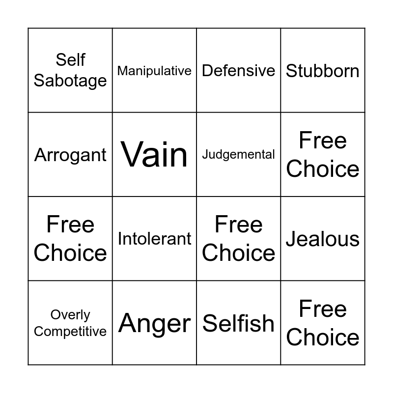 This bingo card has 16 words: Anger, Jealous, Defensive, Self Sabotage, Free Choice, Manipulative, Free Choice, Selfish, Arrogant, Vain, Overly Competitive, Stubborn, Intolerant, Free Choice, Judgemental and Free Choice.