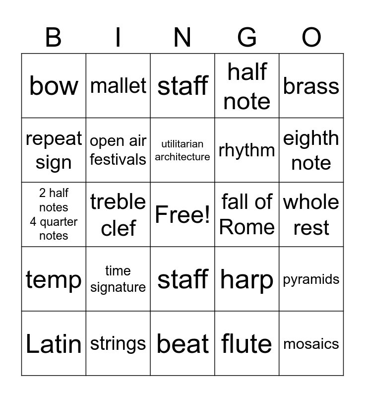 This bingo card has a free space and 29 words: Latin, Gregorian chant, treble clef, quarter rest, bow, staff, open air festivals, time signature, fall of Rome, strings, whole rest, mosaics, beat, flute, eighth note, guitar, staff, temp, brass, 2 half notes 4 quarter notes, harp, percussion, rhythm, repeat sign, half note, mallet, pyramids, utilitarian architecture and idealistic beauty.