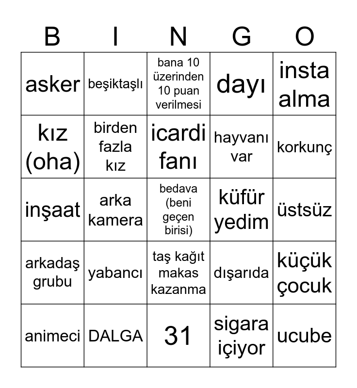 This bingo card has a free space and 24 words: yabancı, DALGA, icardi fanı, animeci, insta alma, asker, kız (oha), beşiktaşlı, küfür yedim, taş kağıt makas kazanma, hayvanı var, inşaat, dışarıda, küçük çocuk, birden fazla kız, sigara içiyor, üstsüz, bana 10 üzerinden 10 puan verilmesi, korkunç, arka kamera, ucube, arkadaş grubu, dayı and 31.