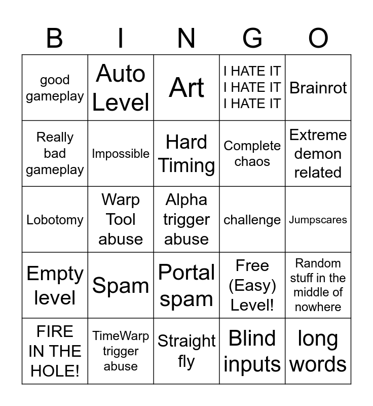 This bingo card has 25 words: Spam, Straight fly, Hard Timing, FIRE IN THE HOLE!, Brainrot, good gameplay, Really bad gameplay, Auto Level, challenge, Portal spam, Complete chaos, Lobotomy, Free (Easy) Level!, Random stuff in the middle of nowhere, Impossible, long words, Jumpscares, Art, Extreme demon related, Warp Tool abuse, Alpha trigger abuse, TimeWarp trigger abuse, Empty level, I HATE IT I HATE IT I HATE IT and Blind inputs.