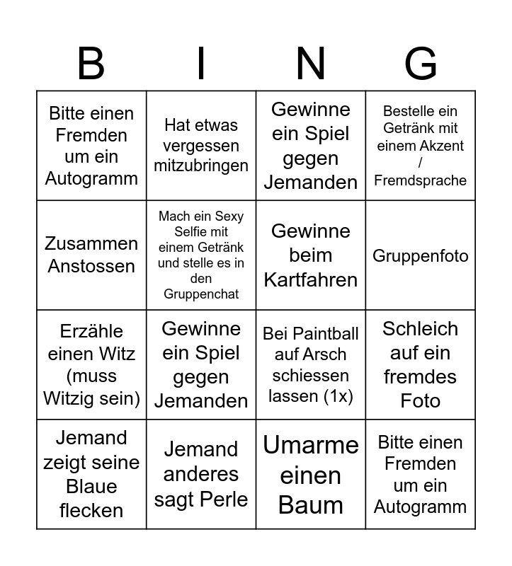 This bingo card has 18 words: Gewinne ein Spiel gegen Jemanden, Bitte einen Fremden um ein Autogramm, Gewinne ein Spiel gegen Jemanden, Bitte einen Fremden um ein Autogramm, Bei Paintball auf Arsch schiessen lassen (1x), Bestelle ein Getränk mit einem Akzent / Fremdsprache, Jemand zeigt seine Blaue flecken, Hat etwas vergessen mitzubringen, Gruppenfoto, Erzähle einen Witz (muss Witzig sein), Umarme einen Baum, Zusammen Anstossen, Schleich auf ein fremdes Foto, Mach ein Sexy Selfie mit einem Getränk und stelle es in den Gruppenchat, Gewinne beim Kartfahren, Trage jemanden Huckepack, Jemand anderes sagt Perle and Mache einer Fremden Person ein Kompliment.