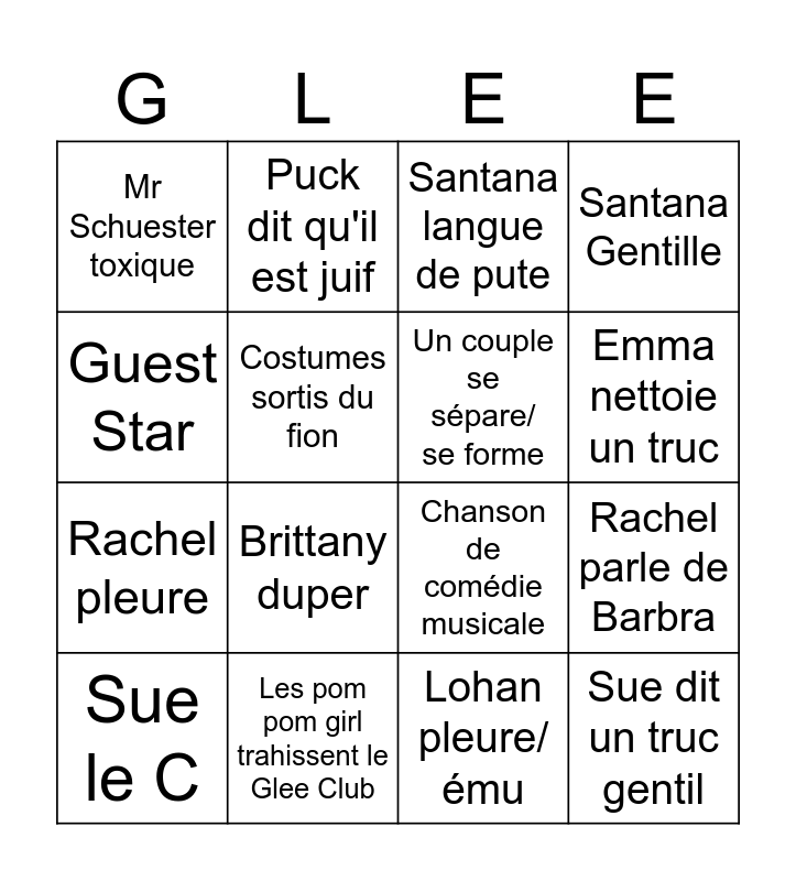 This bingo card has 20 words: Rachel parle de Barbra, Beiste mange un poulet entier, Santana langue de pute, Kurt porte un chapeau, Sue le C, Guest Star, Les pom pom girl trahissent le Glee Club, Mr Schuester toxique, Rachel pleure, Puck dit qu'il est juif, Brittany duper, Chanson de comédie musicale, Costumes sortis du fion, Sue dit un truc gentil, Un couple se sépare/ se forme, Quelqu'un se prends un granité dans la gueule, Emma nettoie un truc, Santana Gentille, Lohan pleure/ému and Breadsticks.