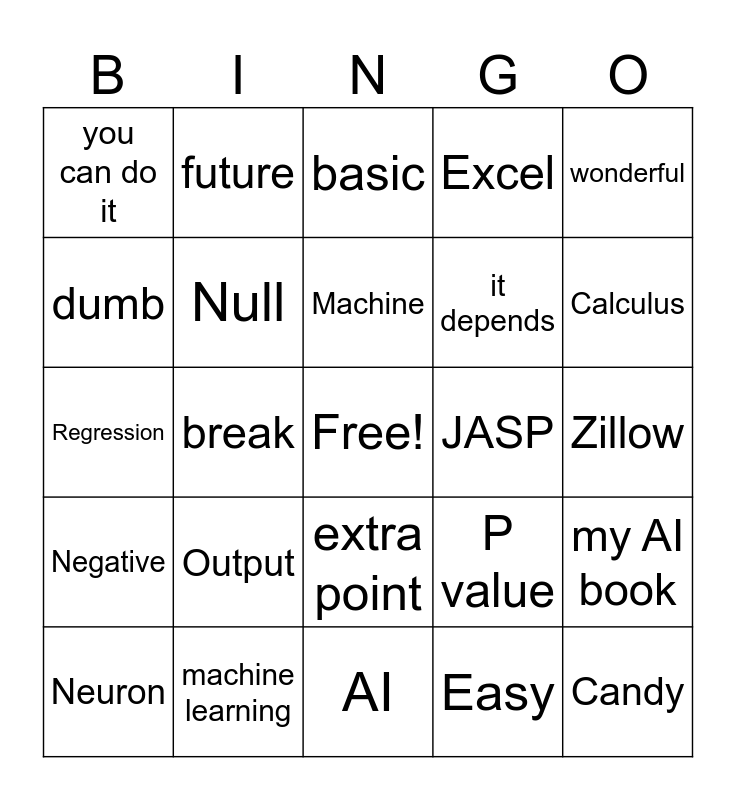 This bingo card has a free space and 24 words: Neuron, Output, Machine, Easy, wonderful, you can do it, future, basic, JASP, Zillow, Regression, Null, P value, my AI book, dumb, machine learning, AI, Excel, Calculus, Negative, break, extra point, it depends and Candy.