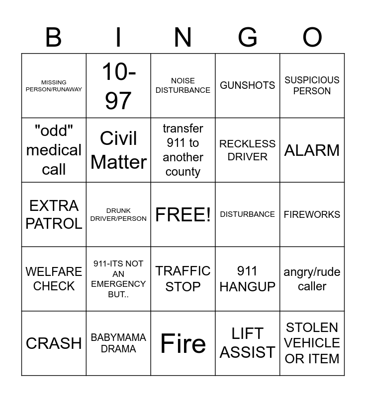 This bingo card has a free space and 24 words: 911-ITS NOT AN EMERGENCY BUT.., BABYMAMA DRAMA, transfer 911 to another county, CRASH, SUSPICIOUS PERSON, MISSING PERSON/RUNAWAY, "odd" medical call, 10-97, DISTURBANCE, TRAFFIC STOP, RECKLESS DRIVER, EXTRA PATROL, 911 HANGUP, angry/rude caller, Civil Matter, LIFT ASSIST, FIREWORKS, NOISE DISTURBANCE, ALARM, DRUNK DRIVER/PERSON, STOLEN VEHICLE OR ITEM, WELFARE CHECK, GUNSHOTS and Fire.