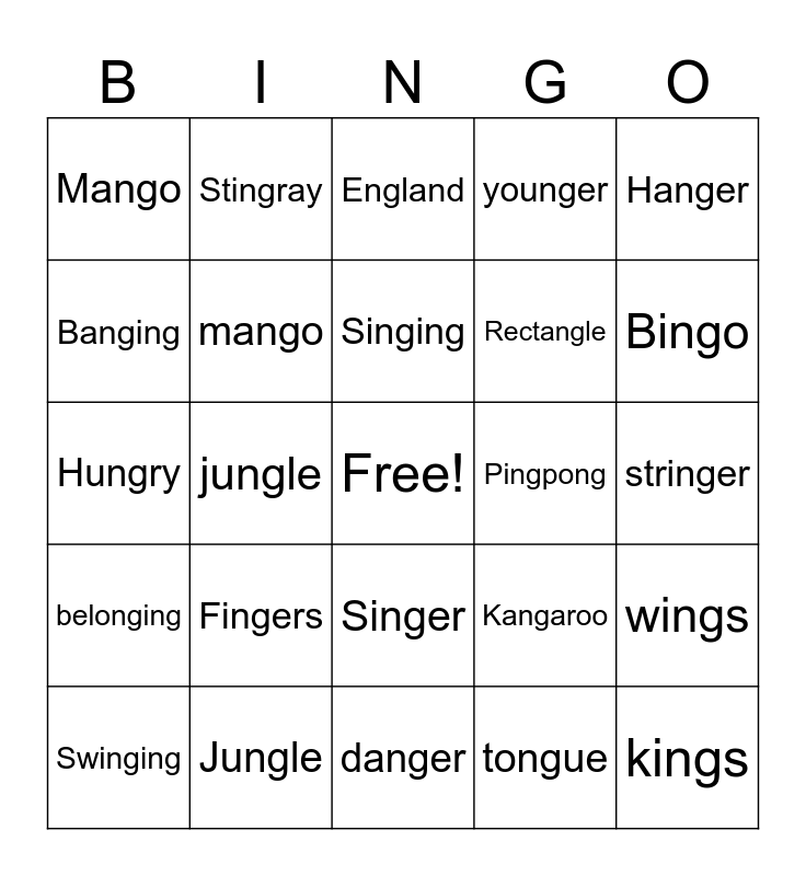 This bingo card has a free space and 24 words: Fingers, Jungle, Singing, Swinging, Hanger, Mango, Banging, Stingray, Pingpong, Singer, Rectangle, Hungry, Kangaroo, wings, mango, tongue, stringer, England, Bingo, jungle, kings, belonging, younger and danger.