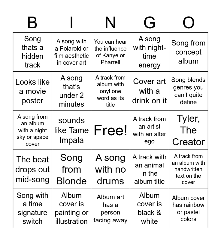 This bingo card has a free space and 24 words: Song from Blonde, Album cover is painting or illustration, A track from album with onyl one word as its title, Song with a time signature switch, Song from concept album, Song thats a hidden track, Looks like a movie poster, A song with a Polaroid or film aesthetic in cover art, A track from an artist with an alter ego, A song with no drums, Cover art with a drink on it, A song from an album with a night sky or space cover, A track with an animal in the album title, A track from an album with handwritten text on the cover, A song that’s under 2 minutes, Album cover is black & white, Tyler, The Creator, You can hear the influence of Kanye or Pharrell, Song blends genres you can’t quite define, sounds like Tame Impala, Album cover has rainbow or pastel colors, The beat drops out mid-song, A song with night-time energy and Album art has a person facing away.