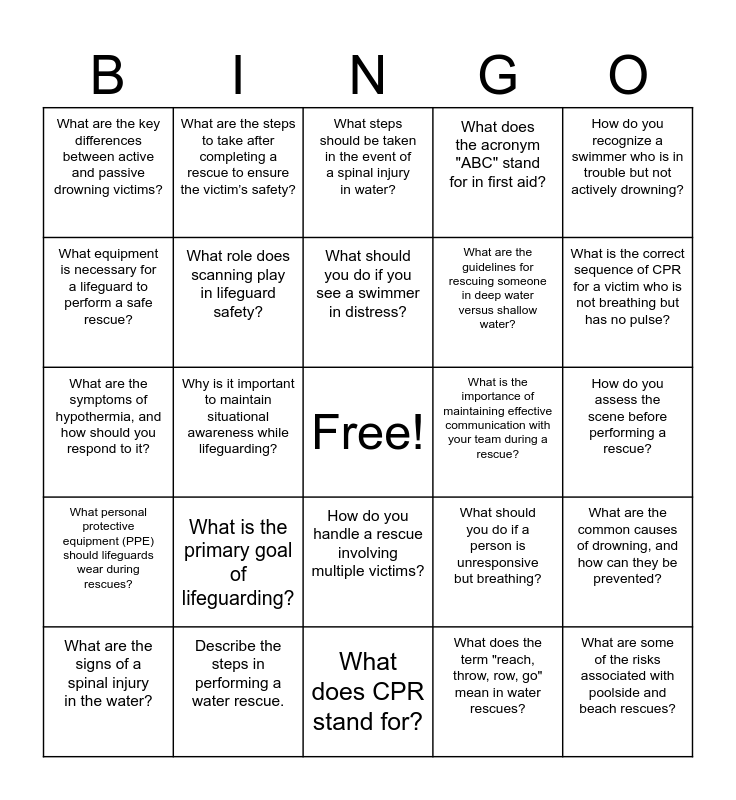 This bingo card has a free space and 24 words: What is the primary goal of lifeguarding?, Describe the steps in performing a water rescue., What should you do if you see a swimmer in distress?, What are the signs of a spinal injury in the water?, How do you recognize a swimmer who is in trouble but not actively drowning?, What are the key differences between active and passive drowning victims?, What equipment is necessary for a lifeguard to perform a safe rescue?, What are the steps to take after completing a rescue to ensure the victim’s safety?, What is the importance of maintaining effective communication with your team during a rescue?, How do you handle a rescue involving multiple victims?, What are the guidelines for rescuing someone in deep water versus shallow water?, What are the symptoms of hypothermia, and how should you respond to it?, What should you do if a person is unresponsive but breathing?, What are the common causes of drowning, and how can they be prevented?, What role does scanning play in lifeguard safety?, What does the term "reach, throw, row, go" mean in water rescues?, How do you assess the scene before performing a rescue?, What steps should be taken in the event of a spinal injury in water?, What is the correct sequence of CPR for a victim who is not breathing but has no pulse?, Why is it important to maintain situational awareness while lifeguarding?, What are some of the risks associated with poolside and beach rescues?, What personal protective equipment (PPE) should lifeguards wear during rescues?, What does the acronym "ABC" stand for in first aid? and What does CPR stand for?.