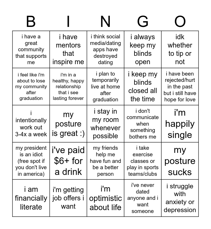 This bingo card has a free space and 24 words: i've paid $6+ for a drink, i'm getting job offers i want, i plan to temporarily live at home after graduation, i am financially literate, idk whether to tip or not, i have a great community that supports me, i feel like i'm about to lose my community after graduation, i have mentors that inspire me, i don't communicate when something bothers me, my friends help me have fun and be a better person, i keep my blinds closed all the time, i intentionally work out 3-4x a week, i take exercise classes or play in sports teams/clubs, my posture sucks, i'm in a healthy, happy relationship that i see lasting forever, i've never dated anyone and i want someone, i'm happily single, i think social media/dating apps have destroyed dating, i have been rejected/hurt in the past but i still have hope for love, my posture is great :), i struggle with anxiety or depression, my president is an idiot (free spot if you don't live in america), i always keep my blinds open and i'm optimistic about life.