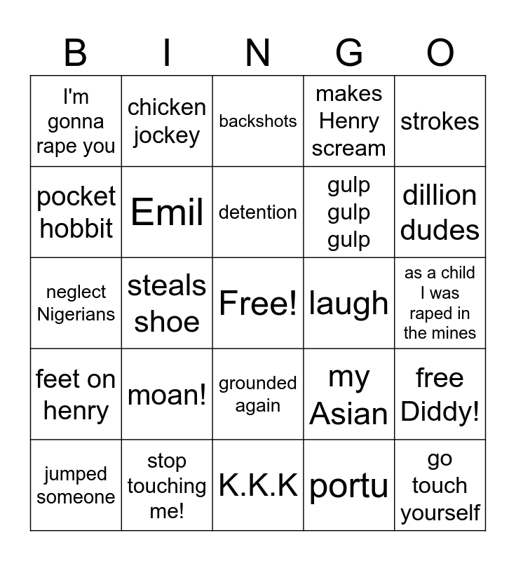 This bingo card has a free space and 24 words: moan!, stop touching me!, detention, jumped someone, strokes, I'm gonna rape you, pocket hobbit, chicken jockey, laugh, grounded again, gulp gulp gulp, neglect Nigerians, my Asian, free Diddy!, Emil, portu, as a child I was raped in the mines, backshots, dillion dudes, steals shoe, go touch yourself, feet on henry, makes Henry scream and K.K.K.