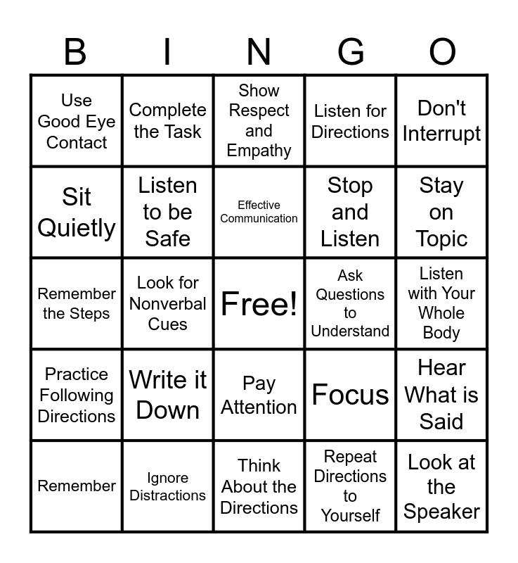 This bingo card has a free space and 29 words: Remember, Learn New Skills, Look for Nonverbal Cues, Follow Directions, Use Good Eye Contact, Show Respect and Empathy, Listen to be Safe, Write it Down, Ask Questions to Understand, Ignore Distractions, Listen with Your Whole Body, Look at the Speaker, Think About the Directions, Repeat Directions to Yourself, Stay on Topic, Resolve Conflicts, Pay Attention, Practice Following Directions, Don't Interrupt, Remember the Steps, Focus, Wait Your Turn to Speak, Stop and Listen, Sit Quietly, Listen for Directions, Complete the Task, Hear What is Said, Effective Communication and Build Positive Relationships.