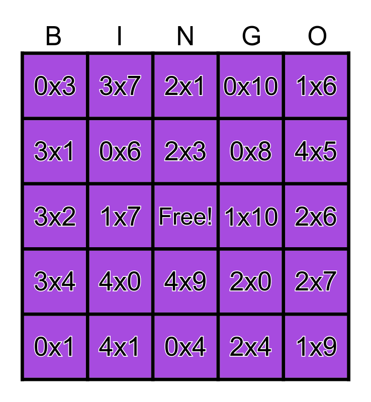 This bingo card has a free space and 55 words: 0x0, 0x1, 0x2, 0x3, 0x4, 0x5, 0x6, 0x7, 0x8, 0x9, 0x10, 1x1, 1x2, 1x3, 1x4, 1x5, 1x6, 1x7, 1x8, 1x9, 1x10, 1x0, 2x0, 2x1, 2x2, 2x3, 2x4, 2x5, 2x6, 2x7, 2x8, 2x9, 2x10, 3x0, 3x1, 3x2, 3x3, 3x4, 3x5, 3x6, 3x7, 3x8, 3x9, 3x10, 4x0, 4x1, 4x2, 4x3, 4x4, 4x5, 4x6, 4x7, 4x8, 4x9 and 4x10.