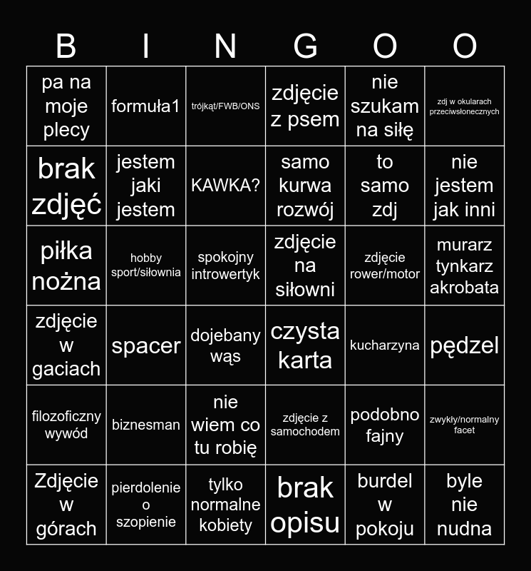 This bingo card has 36 words: zdjęcie z samochodem, nie wiem co tu robię, brak opisu, brak zdjęć, zdjęcie w gaciach, zdjęcie na siłowni, jestem jaki jestem, tylko normalne kobiety, nie szukam na siłę, podobno fajny, nie jestem jak inni, zdjęcie z psem, zwykły/normalny facet, hobby sport/siłownia, samo kurwa rozwój, pa na moje plecy, filozoficzny wywód, zdjęcie rower/motor, piłka nożna, trójkąt/FWB/ONS, spokojny introwertyk, spacer, czysta karta, dojebany wąs, kucharzyna, formuła1, to samo zdj, pierdolenie o szopienie, KAWKA?, zdj w okularach przeciwsłonecznych, byle nie nudna, Zdjęcie w górach, pędzel, murarz tynkarz akrobata, biznesman and burdel w pokoju.