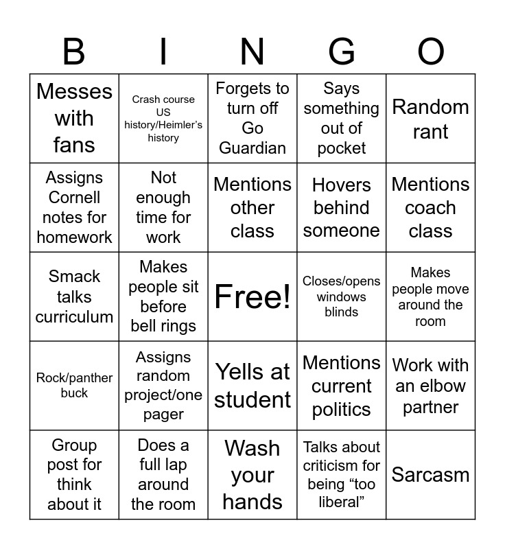 This bingo card has a free space and 24 words: Assigns random project/one pager, Does a full lap around the room, Mentions other class, Group post for think about it, Random rant, Messes with fans, Assigns Cornell notes for homework, Crash course US history/Heimler’s history, Closes/opens windows blinds, Yells at student, Hovers behind someone, Smack talks curriculum, Mentions current politics, Work with an elbow partner, Not enough time for work, Talks about criticism for being “too liberal”, Makes people move around the room, Forgets to turn off Go Guardian, Mentions coach class, Makes people sit before bell rings, Sarcasm, Rock/panther buck, Says something out of pocket and Wash your hands.