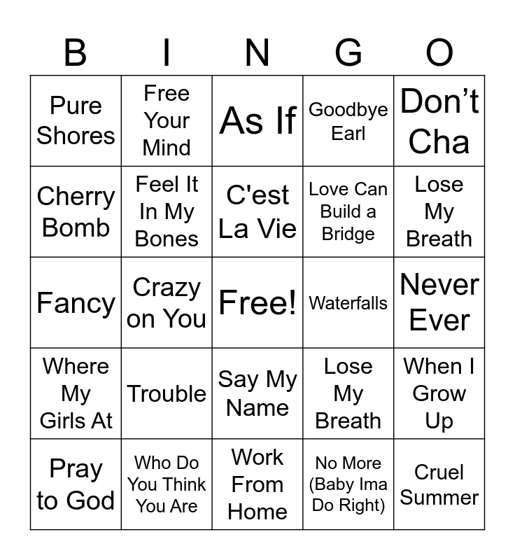 This bingo card has a free space and 76 words: AKB48, All The Things She Said, As If, Back in Your Head, Barracuda, Be My Baby, Bills Bills Bills, Black Magic, BO$$, Bootylicious, Breathless, Bug A Boo, C'est La Vie, Cherry Bomb, Cowboy Take Me Away, Crazy on You, Creep, Cruel Summer, Damaged, Don’t Cha, Falling, Fancy, Feel It In My Bones, Free Your Mind, Goodbye Earl, He Loves U Not, Hold On, How You Like That, I Am The Best, I Do, I love It, Kill This Love, Leader of The Pack, Lose My Breath, Lose My Breath, Love Can Build a Bridge, Mama He's Crazy, Manic Monday, Never Ever, No More (Baby Ima Do Right), No Scrubs, Not Gonna Get Us, Patron Tequila, Point of No Return, Potential Breakup Song, Power, Pray to God, Pure Shores, Push The Button, React, Rush, Say My Name, Say You'll Be There, Shoop, Show Stopper, Si Me Llamas, Sound of the Underground, Spice Up Your Life, Strut, Touch, Trouble, UK Hun?, Untouched, Venus, Walking With A Ghost, Wannabe, Waterfalls, We Are Family, What About Us, Whatta Man, When I Grow Up, Where My Girls At, Who Do You Think You Are, Wings, Work From Home and You Cant Hurry Love.