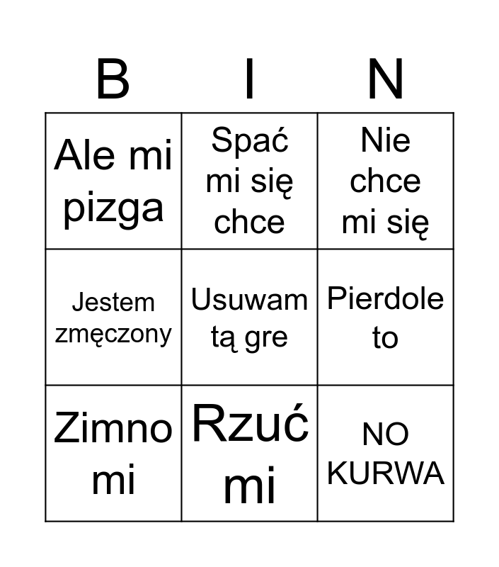 This bingo card has 9 words: Zimno mi, Nie chce mi się, Spać mi się chce, Jestem zmęczony, Ale mi pizga, Pierdole to, Usuwam tą gre, NO KURWA and Rzuć mi.