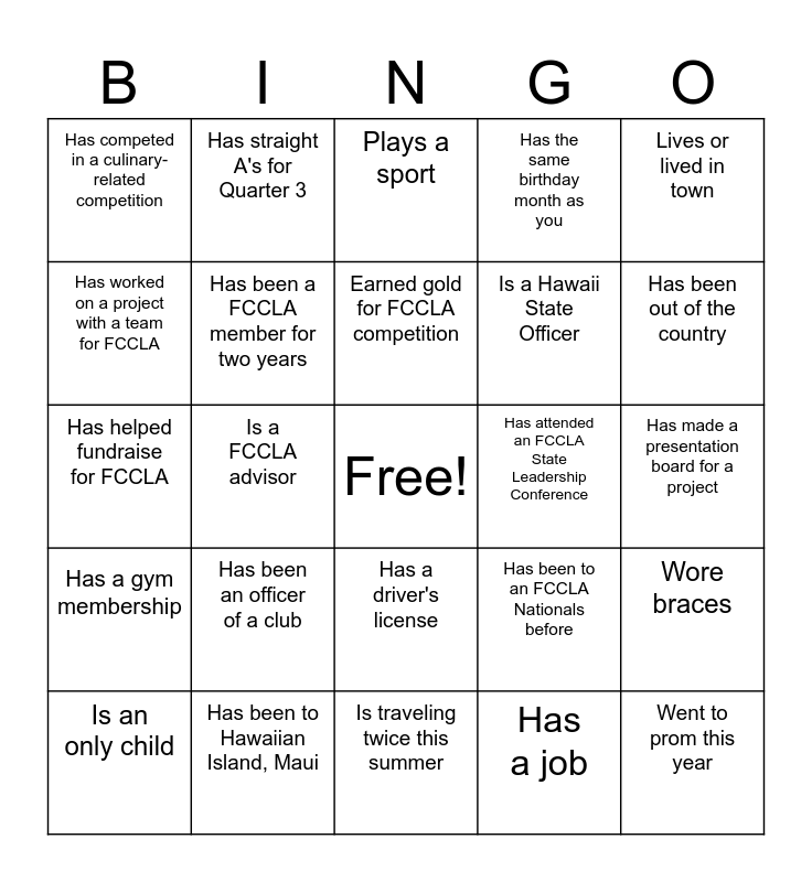 This bingo card has a free space and 24 words: Has been an officer of a club, Has been to Hawaiian Island, Maui, Earned gold for FCCLA competition, Is an only child, Lives or lived in town, Has competed in a culinary-related competition, Has worked on a project with a team for FCCLA, Has straight A's for Quarter 3, Has attended an FCCLA State Leadership Conference, Has a driver's license, Is a Hawaii State Officer, Has helped fundraise for FCCLA, Has been to an FCCLA Nationals before, Wore braces, Has been a FCCLA member for two years, Has a job, Has made a presentation board for a project, Plays a sport, Has been out of the country, Is a FCCLA advisor, Went to prom this year, Has a gym membership, Has the same birthday month as you and Is traveling twice this summer.