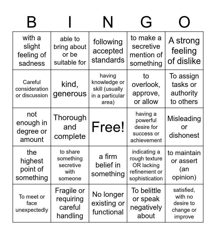 This bingo card has a free space and 24 words: to share something secretive with someone, Fragile or requiring careful handling, having knowledge or skill (usually in a particular area), To meet or face unexpectedly, A strong feeling of dislike, with a slight feeling of sadness, Careful consideration or discussion, able to bring about or be suitable for, having a powerful desire for success or achievement, a firm belief in something, to overlook, approve, or allow, not enough in degree or amount, indicating a rough texture OR lacking refinement or sophistication, to maintain or assert (an opinion), kind, generous, To belittle or speak negatively about, Misleading or dishonest, following accepted standards, To assign tasks or authority to others, Thorough and complete, satisfied, with no desire to change or improve, the highest point of something, to make a secretive mention of something and No longer existing or functional.