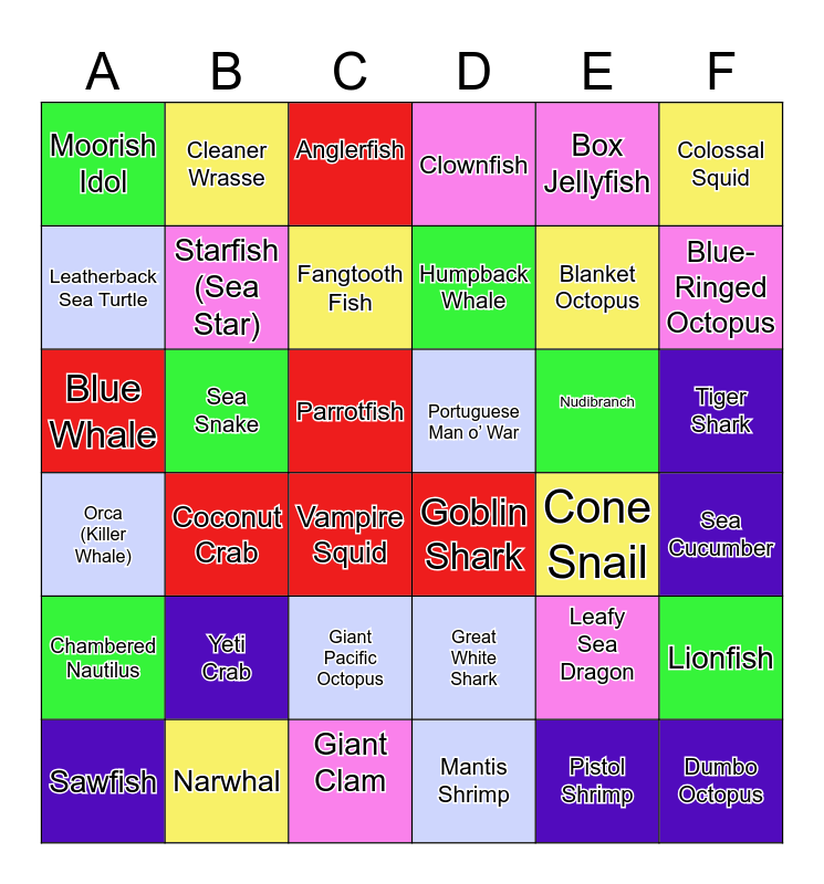 This bingo card has 36 words: Great White Shark, Giant Pacific Octopus, Mantis Shrimp, Leatherback Sea Turtle, Orca (Killer Whale), Portuguese Man o’ War, Starfish (Sea Star), Giant Clam, Box Jellyfish, Leafy Sea Dragon, Blue-Ringed Octopus, Clownfish, Lionfish, Sea Snake, Humpback Whale, Moorish Idol, Chambered Nautilus, Nudibranch, Blue Whale, Anglerfish, Parrotfish, Coconut Crab, Goblin Shark, Vampire Squid, Cone Snail, Cleaner Wrasse, Blanket Octopus, Narwhal, Fangtooth Fish, Colossal Squid, Dumbo Octopus, Sawfish, Sea Cucumber, Tiger Shark, Yeti Crab and Pistol Shrimp.