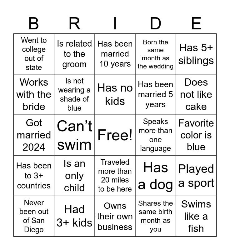 This bingo card has a free space and 24 words: Is an only child, Had 3+ kids, Has no kids, Never been out of San Diego, Has 5+ siblings, Went to college out of state, Works with the bride, Is related to the groom, Speaks more than one language, Traveled more than 20 miles to be here, Has been married 5 years, Got married 2024, Has a dog, Played a sport, Is not wearing a shade of blue, Shares the same birth month as you, Favorite color is blue, Has been married 10 years, Does not like cake, Can’t swim, Swims like a fish, Has been to 3+ countries, Born the same month as the wedding and Owns their own business.