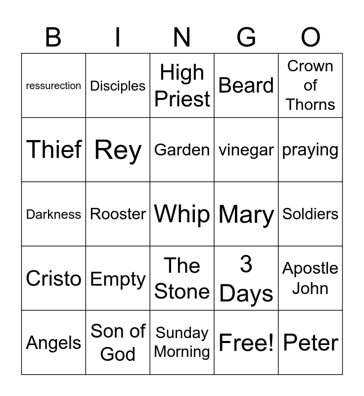 This bingo card has 32 words: Free!, La Pascua, Rooster, Deny me, Cristo, Rey, Crown of Thorns, Apostle John, Disciples, Peter, Garden, High Priest, Nails, Casting Lots, Mary, The Tomb, Angels, Darkness, The Stone, Empty, 3 Days, Jonah, Soldiers, Son of God, Whip, Beard, vinegar, Thief, ressurection, Sunday Morning, Gethsemane and praying.